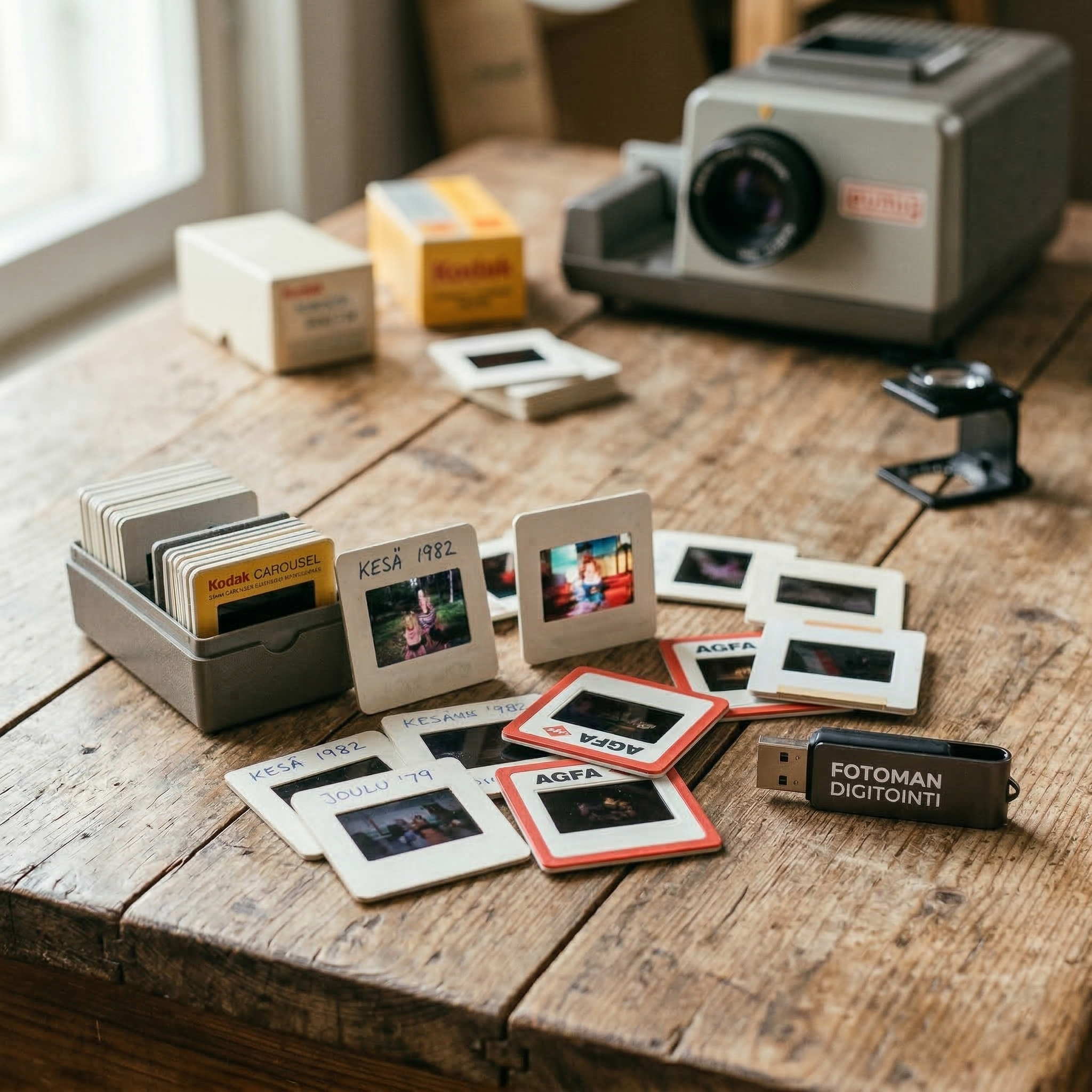Kaapissa pölyttyvät diat sisältävät korvaamattomia hetkiä – matkoja, häitä, lasten ensiaskelia ja arkea, jota ei enää muuten näe. Värit haalistuvat ja muovit haurastuvat vuosi vuodelta. Fotoman skannaa kehystetyt kinodiat ammattikalustolla – tuo diat meille, me hoidamme loput.