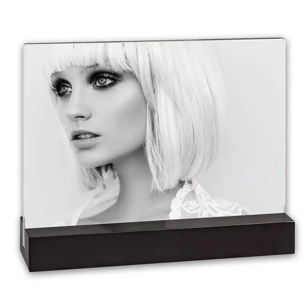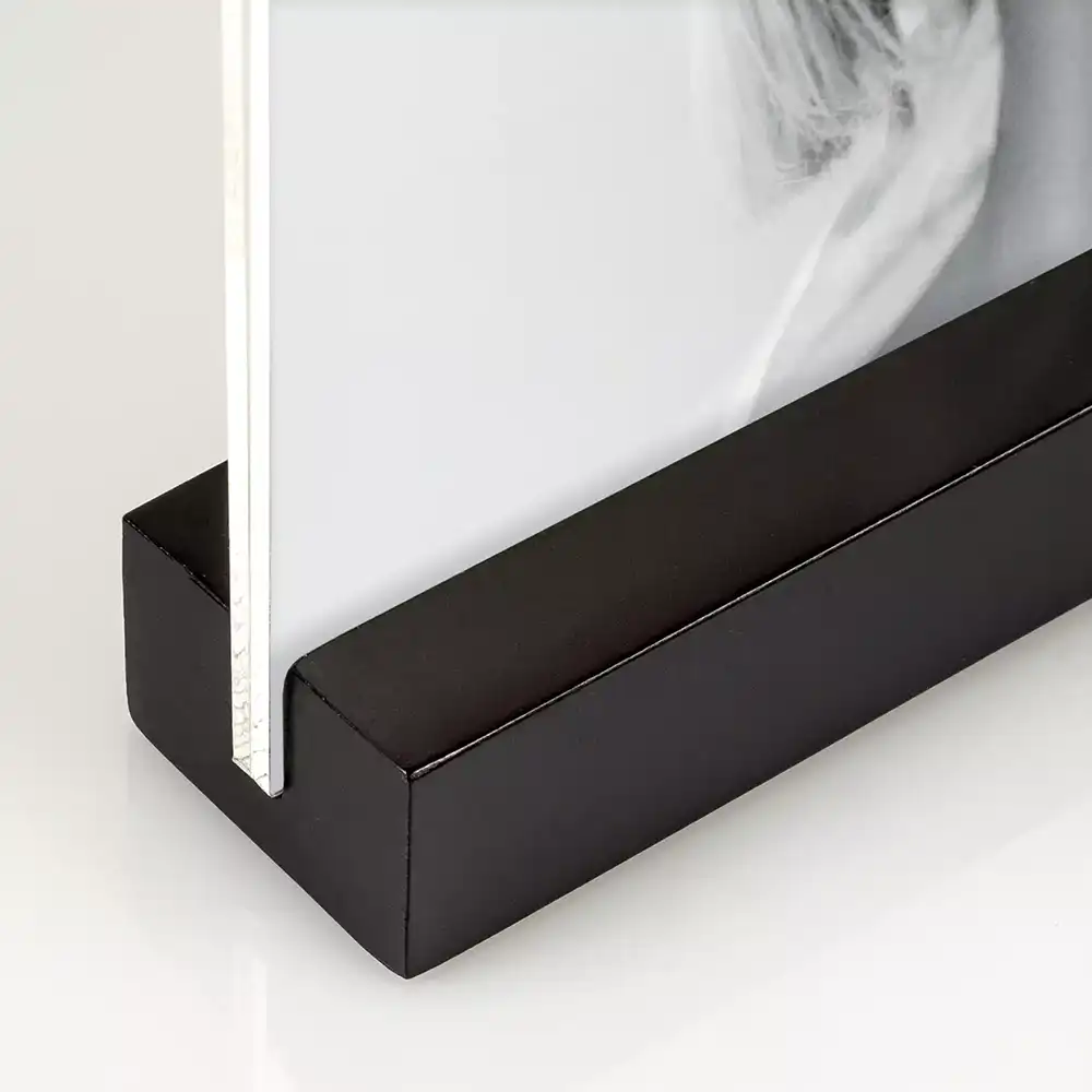 Dresda-akryylikehys on moderni ja kehyksetön vaihtoehto perinteisille kuvakehyksille. Tämä minimalistinen pöytäkehys yhdistää kirkkaan akryylin ja tukevan puujalan, luoden skandinaavisen ilmeen kotiin, toimistoon, myymälään tai messuosastolle.