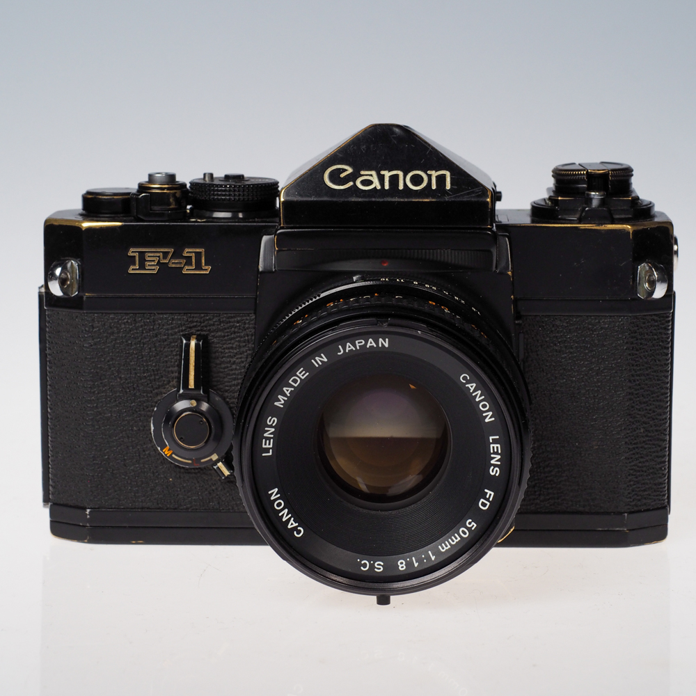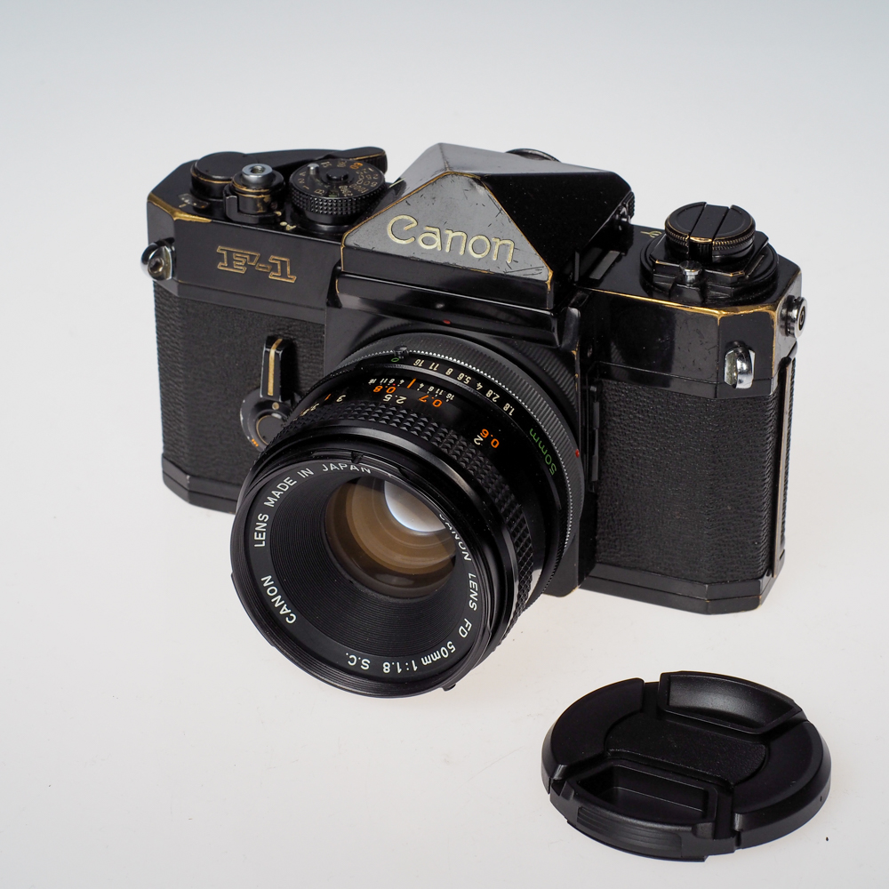 Käytetty Canon F-1 filmirunko ja Canon FD 50mm f/1.8 S.C. – Alkuperäinen Canon F-1 ammattilaisfilmirunko (1971) patinaisessa mutta toimintakuntoisessa kunnossa; etsimen sisällä valotusmittarin reunassa pieni kosmeettinen halkeama. Mukana valoisa FD 50mm f/1.8 S.C. -normaalioptikka ja linssinsuoja.