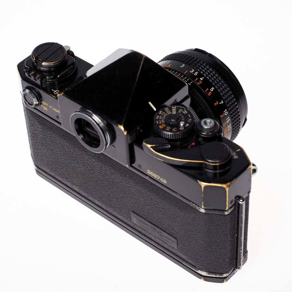 F-1:n täysmetallirunko on rakennettu kestämään vaativia kuvausolosuhteita. Ergonomia on ajaton ja kamera istuu käteen luontevasti. Rungossa on patinaa – kertynyttä elämää vuosikymmenten varrelta – mutta ei isompia kolhuja. Etsimessä on valotusmittarin yläpuolella pieni halkeama, joka ei vaikuta kameran käyttöön eikä kuvien ottamiseen millään tavalla.