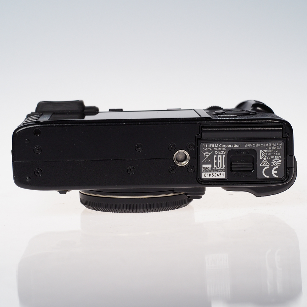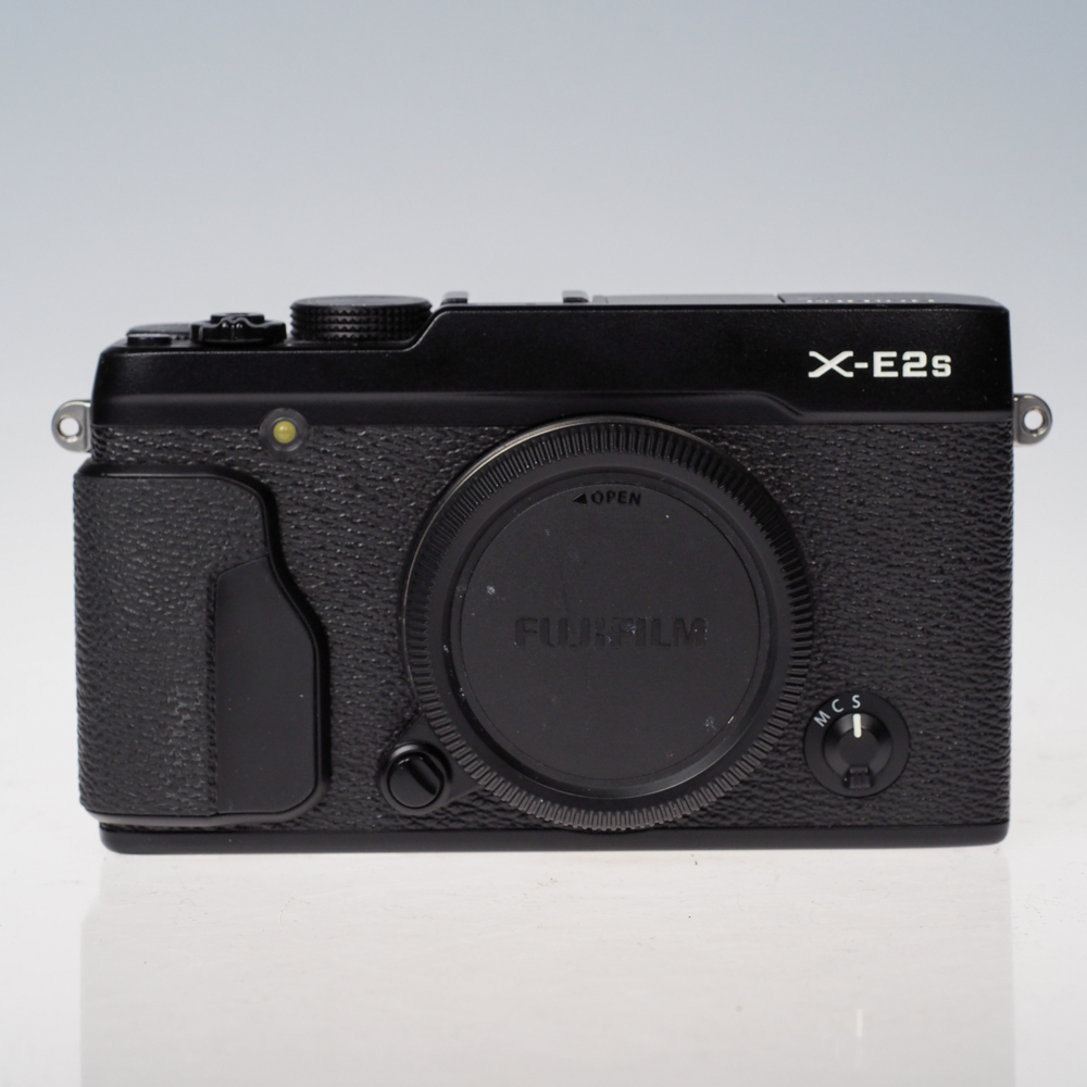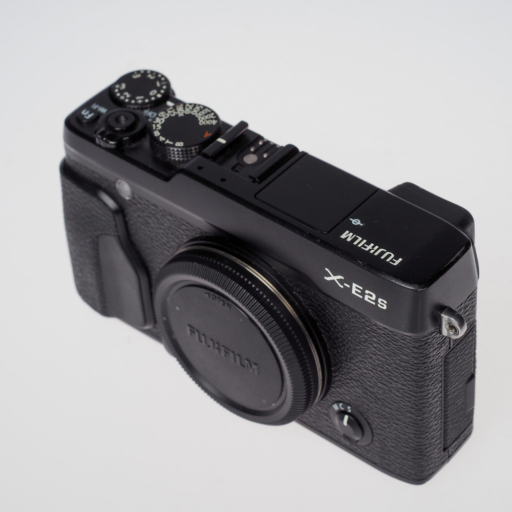 Käytetty Fujifilm X-E2S musta – Hyvässä kunnossa oleva retrotyylinen peilittömäkamera 16 MP X-Trans CMOS II -kennolla, Hybrid AF:lla ja 11 Film Simulation -tilalla; mukana alkuperäinen pakkaus, akku, laturi, kaulahihna, runkotulppa ja ohjekirja.
