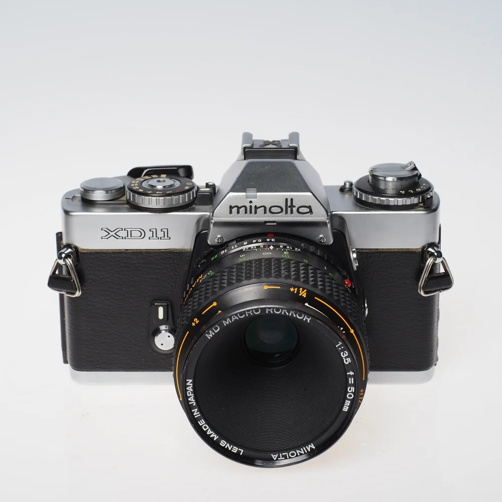 Käytetty Minolta XD11 + MD 50mm Macro f3.5 – Hyvässä kunnossa oleva klassinen filmikamerasetti: Leican kanssa kehitetty XD11-runko aukko- ja sulkinprioriteetilla sekä kirkaslasinen 50mm makro-objektiivi lähikuvaukseen.