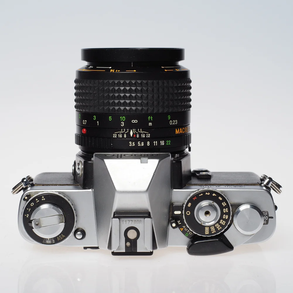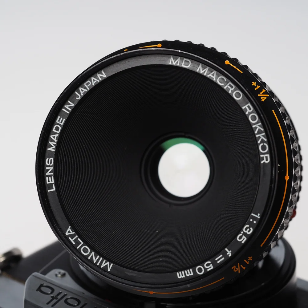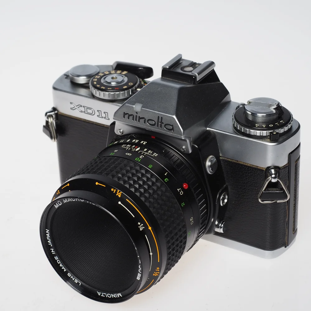 Käytetty Minolta XD11 + MD 50mm Macro f3.5 – klassinen filmisetti lähikuvaukseen ja arkeen