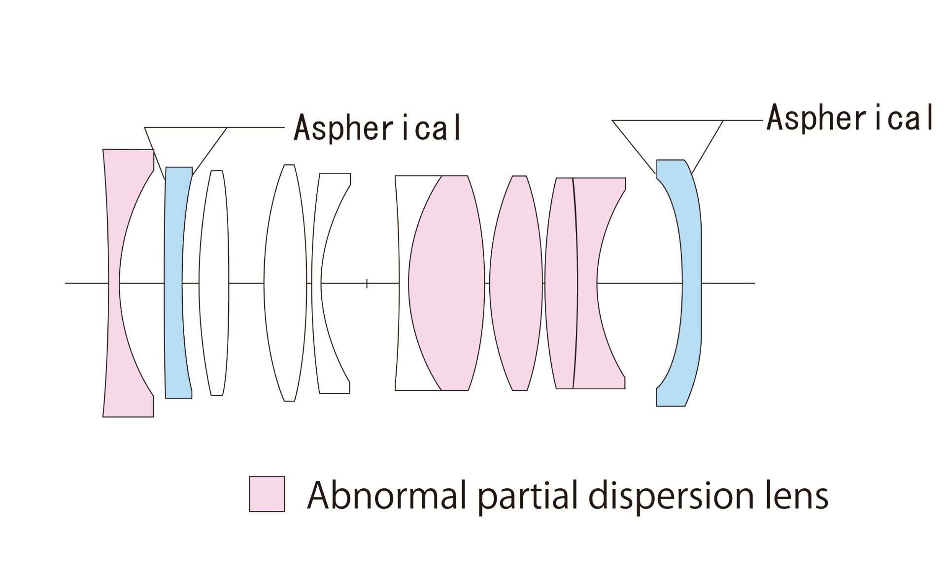 Rakenne: 11 elementtiä 9 ryhmässä (2 asfääristä pintaa, 5 erikoislasia)